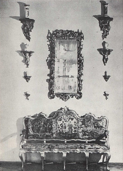 Диван Екатерининского дворца полезно сравнить с двумя другими, происхождение которых неизвестно, но принадлежат они тому же времени. Один из них также резной золоченый, но с несравненно более скромной резьбой, тех же волнообразных форм, но его ножки по традиции все еще скреплены извивающимися проножками. Сохранилась подлинная обивка дивана — вышивка шерстью крестом, с фигурными изображениями.