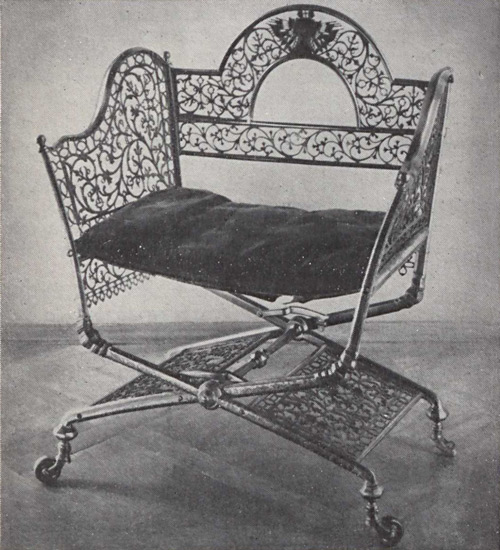 Кресло исполнено из стали и производит впечатление ажурного кружева. Его конструкция исходит из древних складных кресел, известных еще в античности, где они носили название курульных (sedia curulis). Орнамент на них представляет сложные переплетения стеблей и листьев. В верхней части спинки помещен двуглавый орел.