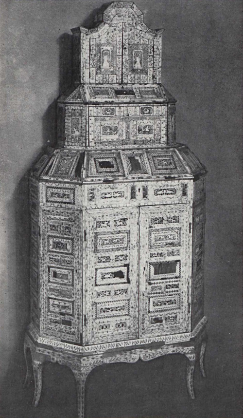 Еще одним высокохудожественным и редким образцом мебельного искусства является шкаф-бюро с набором из моржовой кости работы холмогорских мастеров, исполненный в 1750—1760 гг. Северные резчики издавна славились удивительными работами по кости (ларцы, шкатулки, табакерки и пр.), но крупные произведения их искусства весьма немногочисленны. Ценились они настолько высоко, что, например, подобный шкафчик был поставлен в отделанной Камероном Зеленой столовой Екатерининского дворца в Царском Селе.