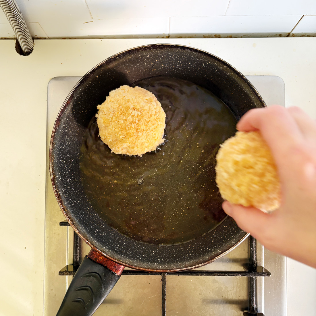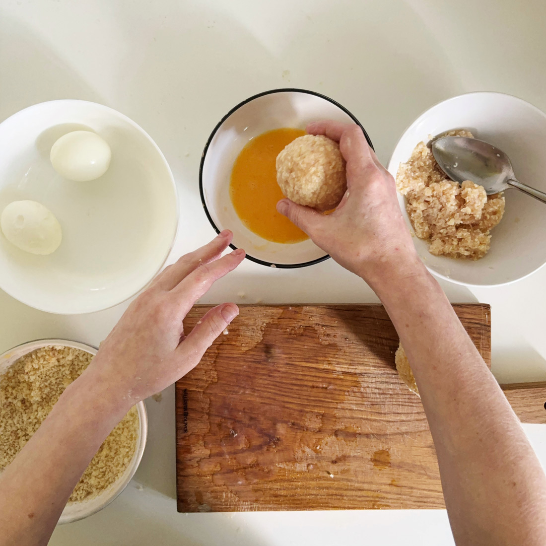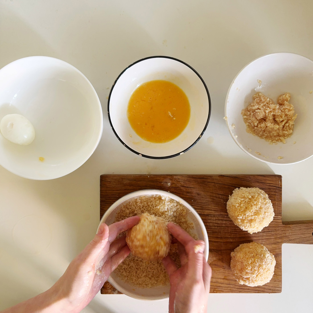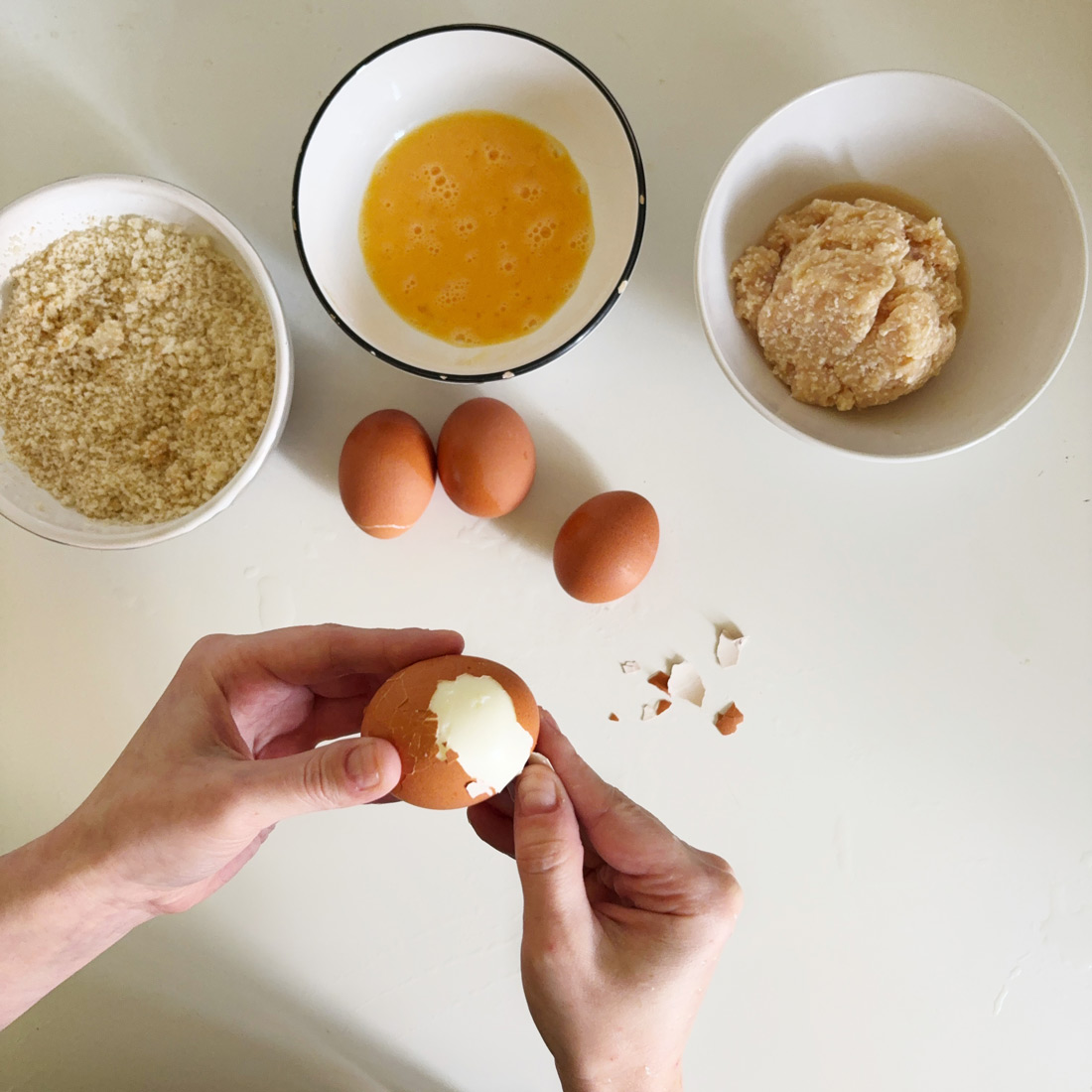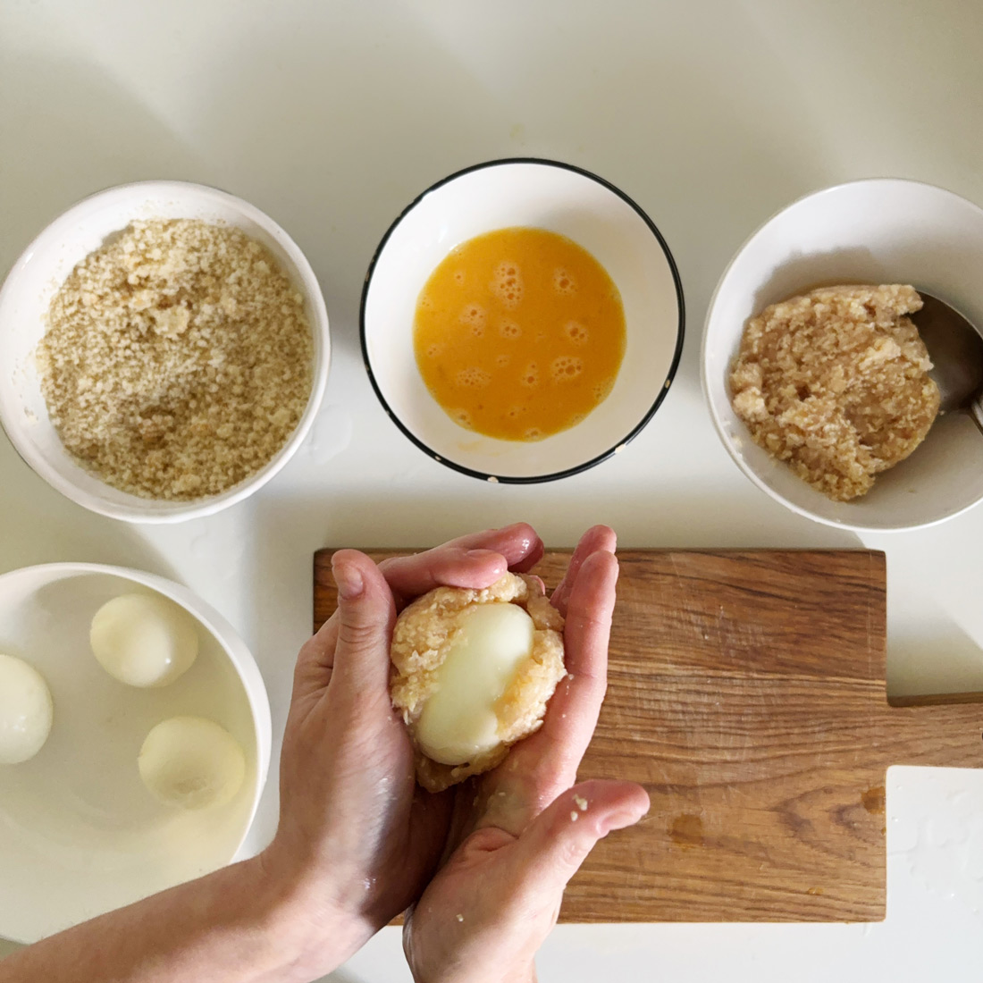 Варёное яйцо очистите, обверните тонким слоем фарша, обмакните в сырое яйцо, обваляйте в крошках белого хлеба и обжарьте на сковороде.