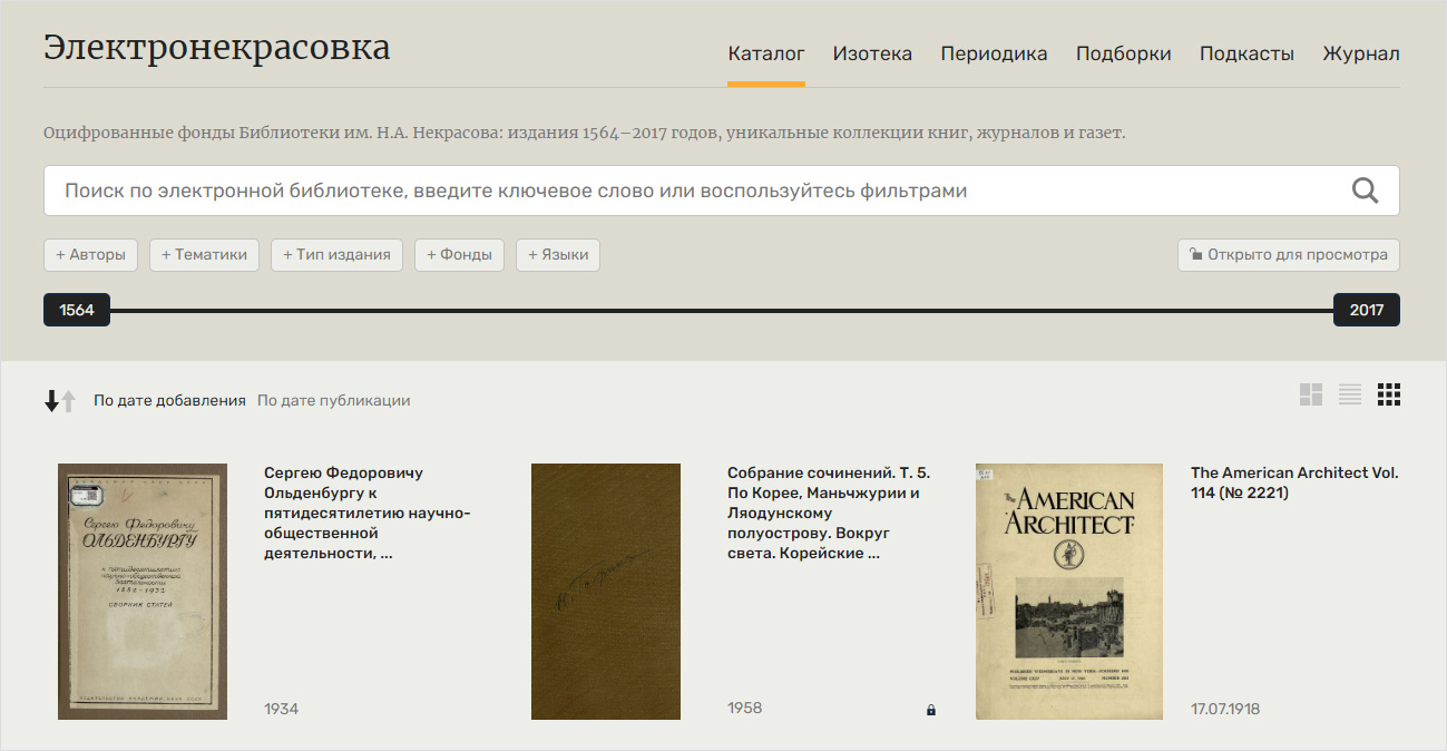 Все новые книги и журналы в первую очередь появляются в общем каталоге «Электронекрасовки». Там же можно применить фильтр «Тип издания», чтобы выбрать соответствующий раздел.
