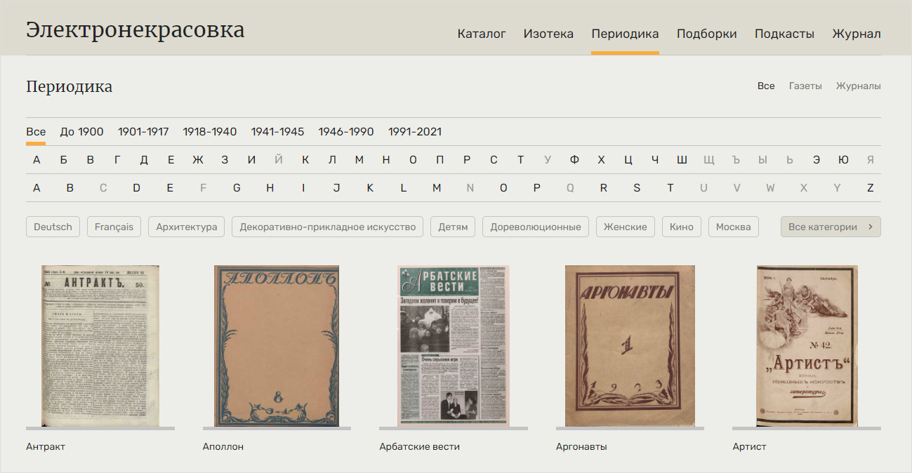 Помимо этого, все журналы и газеты находятся в разделе «Периодика», где они упорядочены по названию, году и месяцу издания.