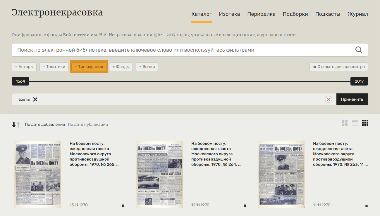 Газеты — один из самых пополняемых разделов. Следить за оцифрованными новинками можно, выбрав пункт «Газеты» в фильтре «Тип издания», газеты по умолчанию отсортируются в каталоге по дате добавления.