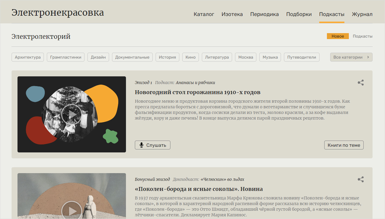 Все новинки некнижных коллекции, а это экслибрисы, спичечные этикетки, промграфика, фотография, открытки и плакаты, можно найти в разделе «Изотека». По умолчанию все новые публикации находятся на первых страницах каталога. Также можно выбрать соответствующую коллекцию в фильтре «Тип издания», чтобы посмотреть её отдельно.