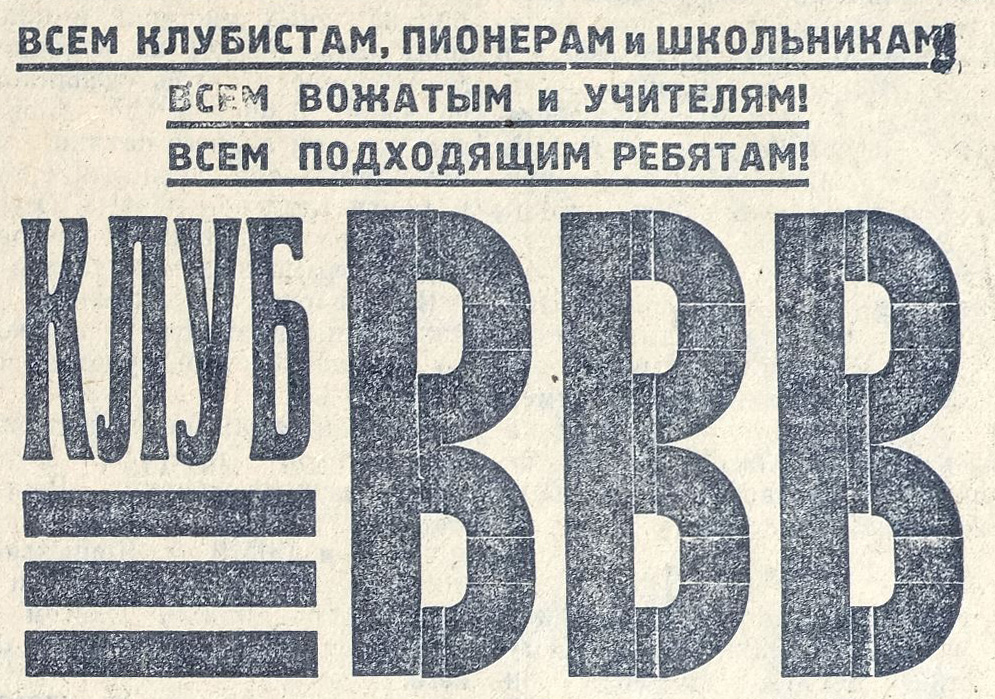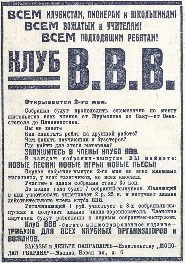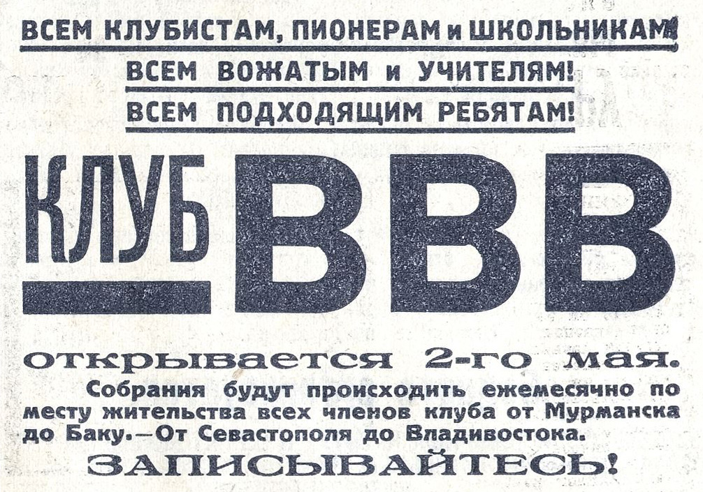 Газета «Известия» № 84 раскрывает карты, рассказывая о загадочном клубе «ВВВ», державшем в напряжении читателей целую неделю. Со 2 мая 1928 года в СССР начал работать методический центр «Клуб В.В.В.», задачами которого были регулярные встречи вожатых и клубных организаторов, а также выпуск печатных сборников с рекомендациями по досугу детей. Было издано как минимум три альманаха с нотами, пьесами, песнями, играми и советами для «скучающих и бузотёров».