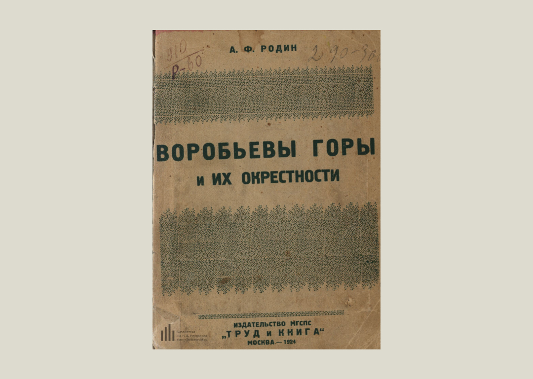А.Ф. Родин. 1924 годПутевой очерк-гид от московского краеведа Александра Родина, в котором рассказывается, «где и что можно увидеть на Воробьёвых горах и куда отсюда можно предпринять прогулки в окрестности». Читателей ждут маршруты, карты и исторические очерки о Воробьёвых горах, прилегающей Москве-реке и ближайших местностях.