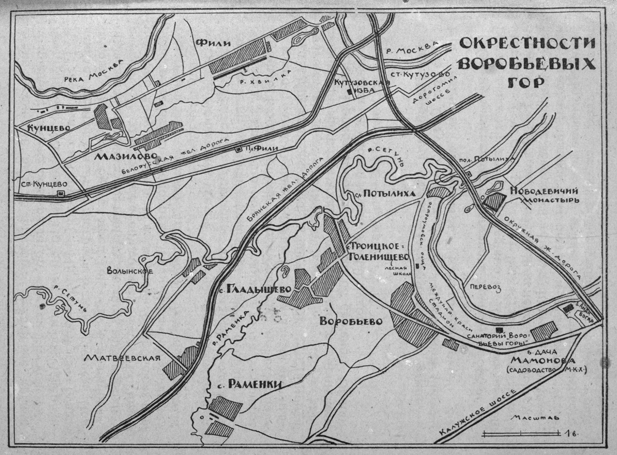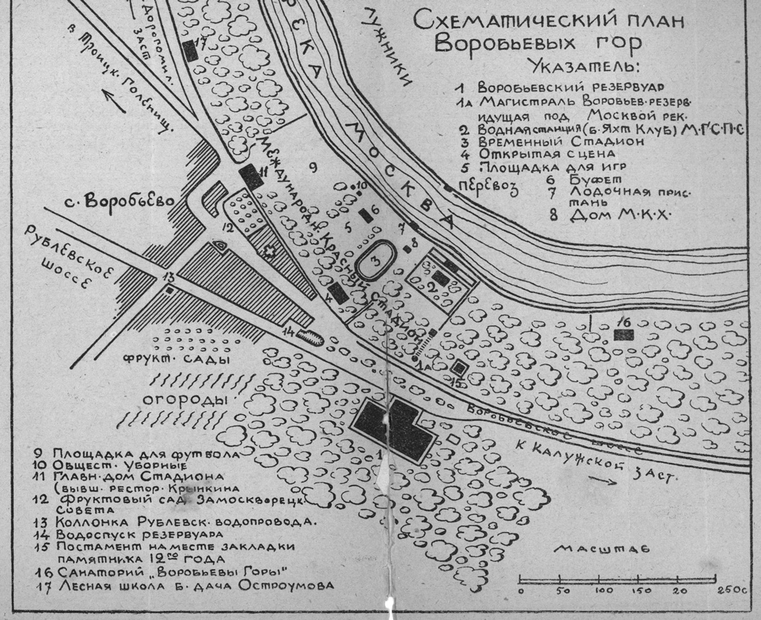 «Воробьёвы горы тем и интересны, что здесь каждый может получить для себя то, что он ищет, — здесь есть места с шумной и многочисленной толпой (Стадион, станция МГСПС, сцена, карусели, буфет и пр.), но есть и тихие укромные уголки — Остроумовская роща, уголок, издавна называемый „Кинь-Грусть“, уединённые высоты, с которых можно часами смотреть на Москву, и, наконец, тихая Москва-река».
