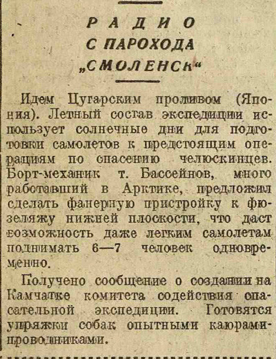 На пароход «Смоленск» погружено 7 самолётов — Молокова, Каманина и других. Из Хабаровска на помощь челюскинцам вылетает Водопьянов. Решено отправить на север ещё один пароход с самолётами лётчиков Доронина, Липпа и Галышева. Из СССР в Америку выехали лётчики Ушаков, Слепнёв и Леваневский. Спешно ремонтируются ледокол «Красин» и ледорез «Литке», которые также должны пойти на помощь экспедиции Шмидта.
