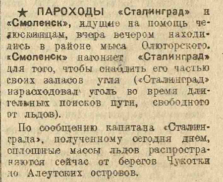 С Чукотки на пароходах «Смоленск» и «Сталинград» челюскинцы отправились на Камчатку.
