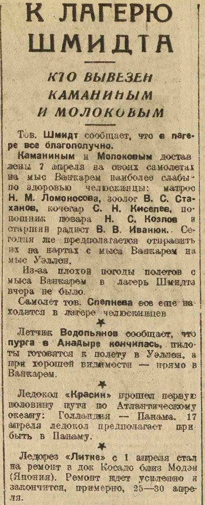 Слепнёв, Каманин и Молоков прилетели из Уэлена в Ванкарем и в тот же день вылетели в лагерь Шмидта. При посадке в лагере у самолёта Слепнёва повреждено шасси. Самолёт остался на льду. Каманин и Молоков доставили из лагеря в Ванкарем 5 пассажиров.