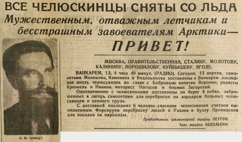 Молоков и Каманин доставили в Ванкарем 35 человек. На льду осталось 28 человек. Заболевший Шмидт по решению правительственной комиссии был переправлен в больницу в городе Ном на Аляске.