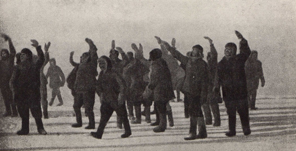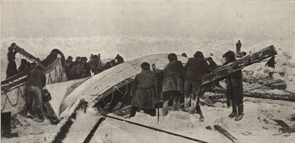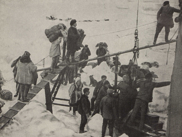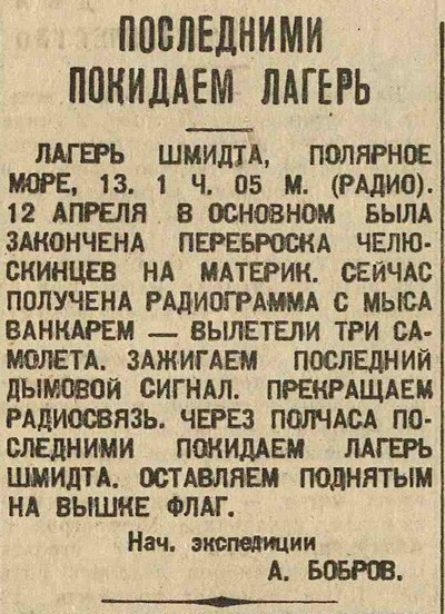 Партия челюскинцев в 8 человек покинула пароход и, пройдя 65 километров по сплошному льду, достигла мыса Дженретлен.
