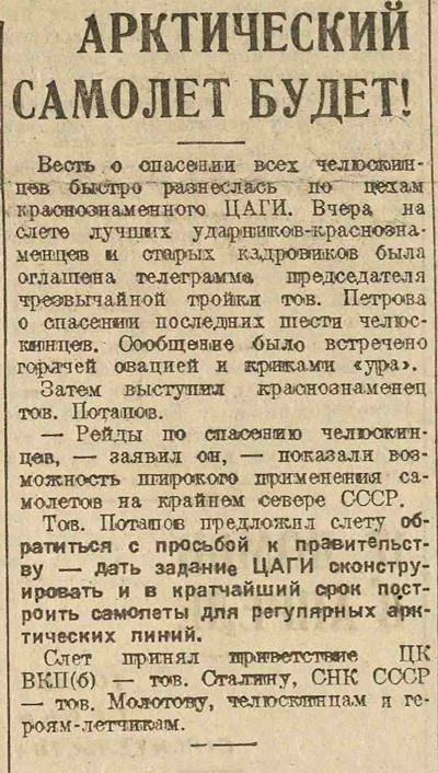 Лётчики Галышев, Доронин и Водопьянов прилетели в Анадырь.