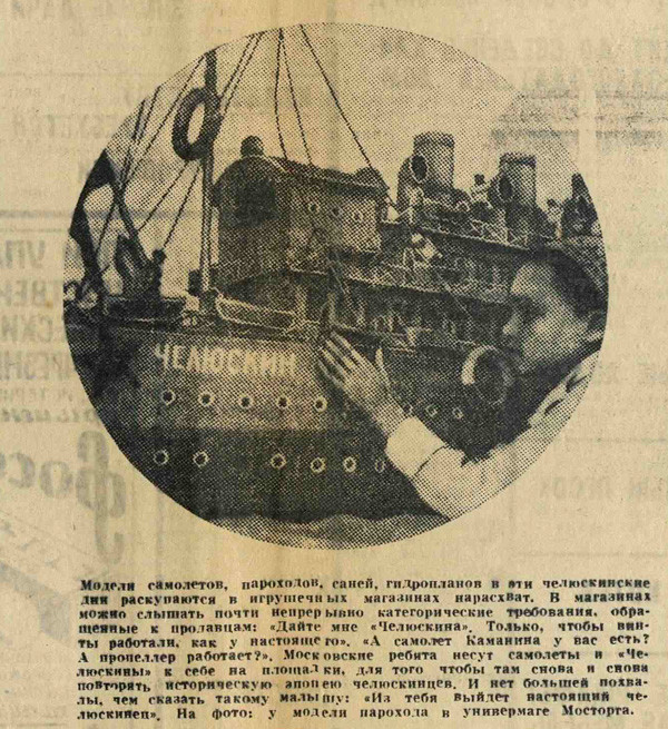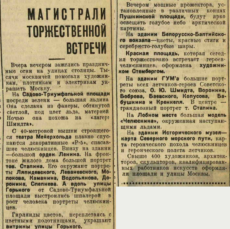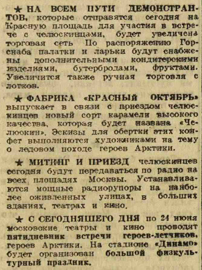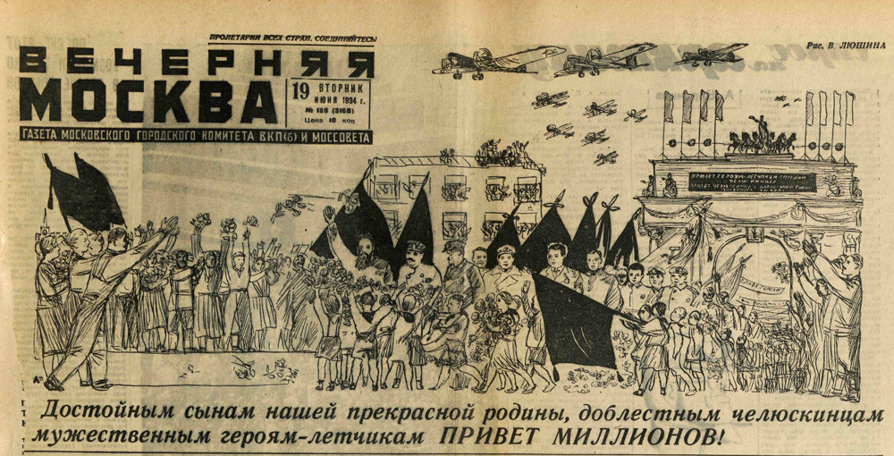 19 июня 1934 года в Москве проходили праздничные гуляния, связанные со встречей главных героев времени «челюскинцев». 13 февраля пароход «Челюскин» под управлением начальника экспедиции Отто Шмидта и капитана Владимира Воронина был раздавлен льдами и затонул в Беринговом проливе. Эвакуированный экипаж в течение двух месяцев жил на льду, всё это время за жизнью и спасением команды наблюдала вся страна. С помощью прессы 1930-х «Электронекрасовка» составила хронику катастрофы и спасения экипажа парохода «Челюскин».