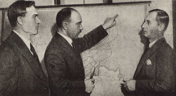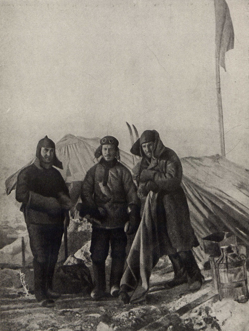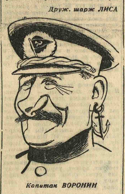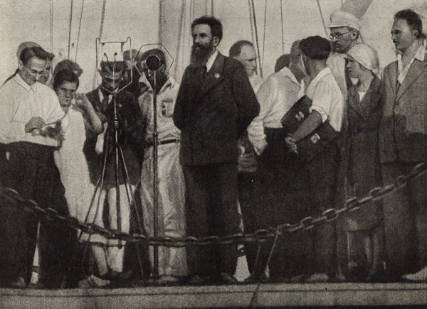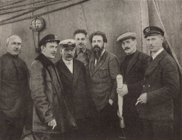 Команда парохода «Челюскина» и ледокола «Красин» в Мурманске. Лётчик Бабушкин, заместитель начальника по хозяйственной части Копусов, капитан Сорокин, заместитель начальника по научной части Баевский, начальник экспедиции Шмидт, капитан «Воронин», капитан «Красина» Легздин.