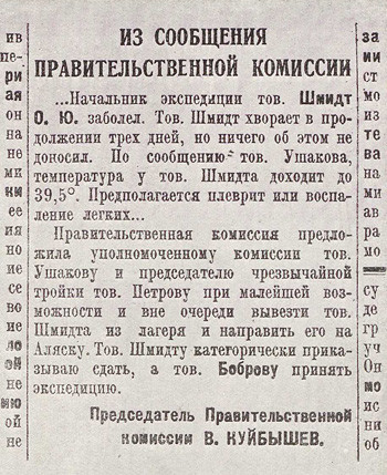 Галышев и Доронин прибыли в Аян. Шмидт телеграфирует из лагеря: «Месяц на льду прошёл очень хорошо. В палатках и уцелевшей половине барака тепло, устроили кухню и пекарню, заболеваний нет. Продовольствием обеспечены на два месяца. Моральное состояние по-прежнему превосходно».
